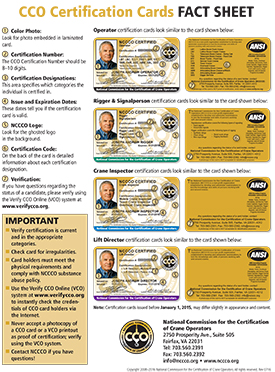 Another key thing is to understand what you are looking for as it relates to an operators certification card. The NCCCO developed a fact sheet for what their certification cards should look like. Review it, print it out and know what you are looking for. Check the card for irregularities and then use the VCO to instantly check the credentials of the card holder.