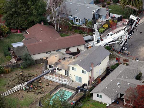 In the image above, an oak tree was being removed from a residence. As the large trunk portion was being lifted, it proved too much for the crane and it tipped over the rear and split this home in two.