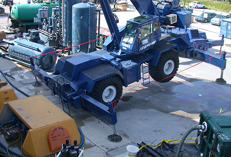 The rough terrain crane pictured above is an example of the load’s leverage exceeding the crane’s leverage, as discussed in part 4. When the crane was overloaded it lost stability, causing the back outriggers to lift off the ground.